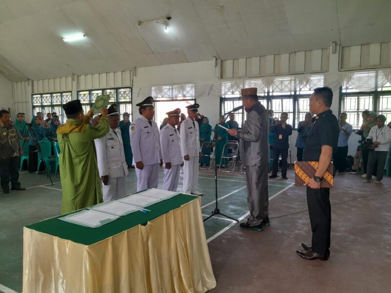 TOUNA – Bupati Tojo Una-Una (Touna), Mohammad Lahay, SE, MM mengambil sumpah dan melantik empat kepala desa (Kades) terpilih Pengganti Antar Waktu (PAW) Tahun 2023 periode 2024–2026 di gedung BPU Desa Marowo, Kecamatan Ulubongka, Kabupaten Touna, Jumat (05/01/24).