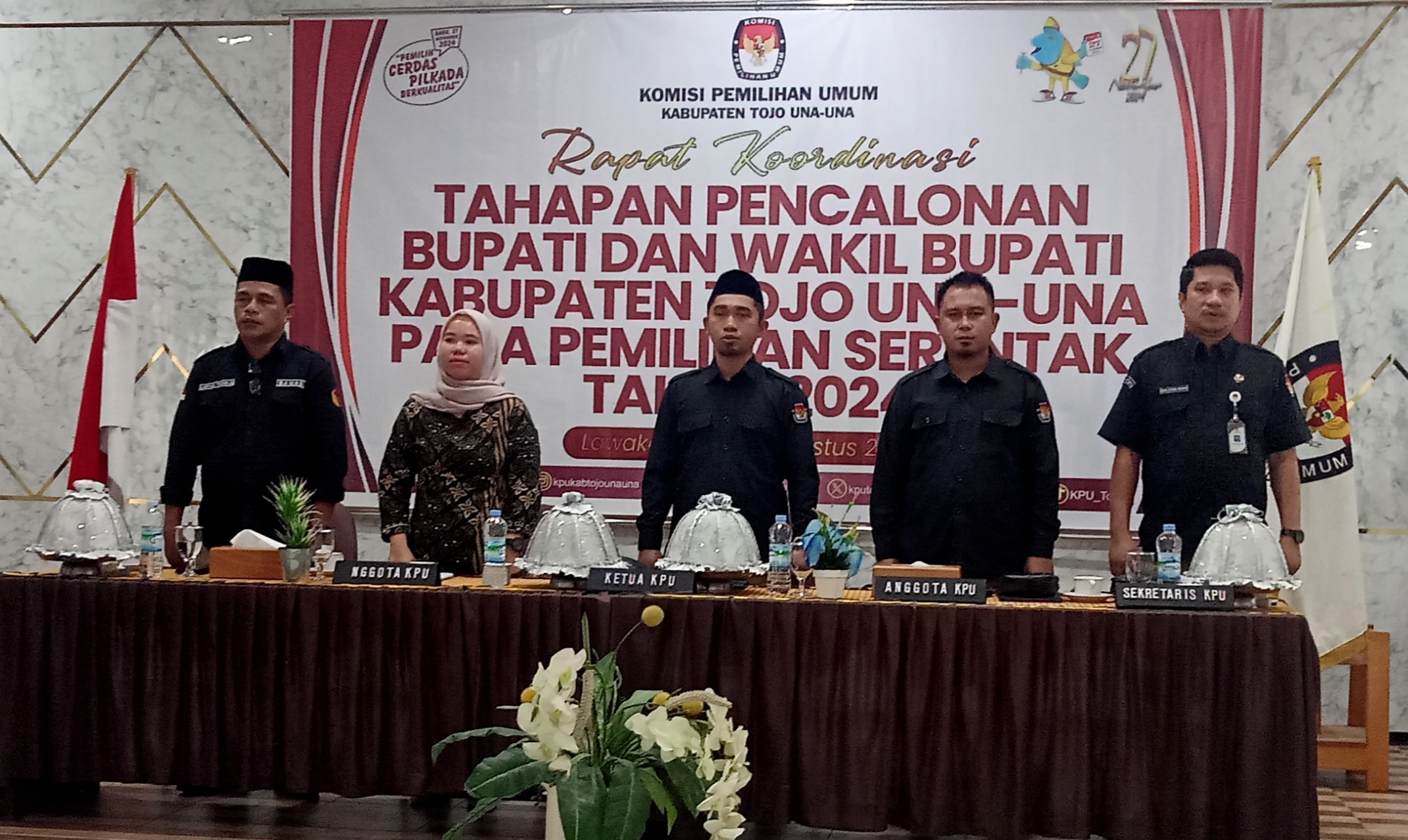 Touna-Komisi pemilihan umum Daerah (KPUD) Kabupaten Tojo Una-una mengelar rapat koordinasi tahapan Pencalonan Bupati dan Wakil Bupati Kabupaten Tojo Una-una pada Pemilihan Serentak tahun 2024,Rabu 7 Agustus 2024.l berlangsung di hotel Lawaka Dondo Ampana.