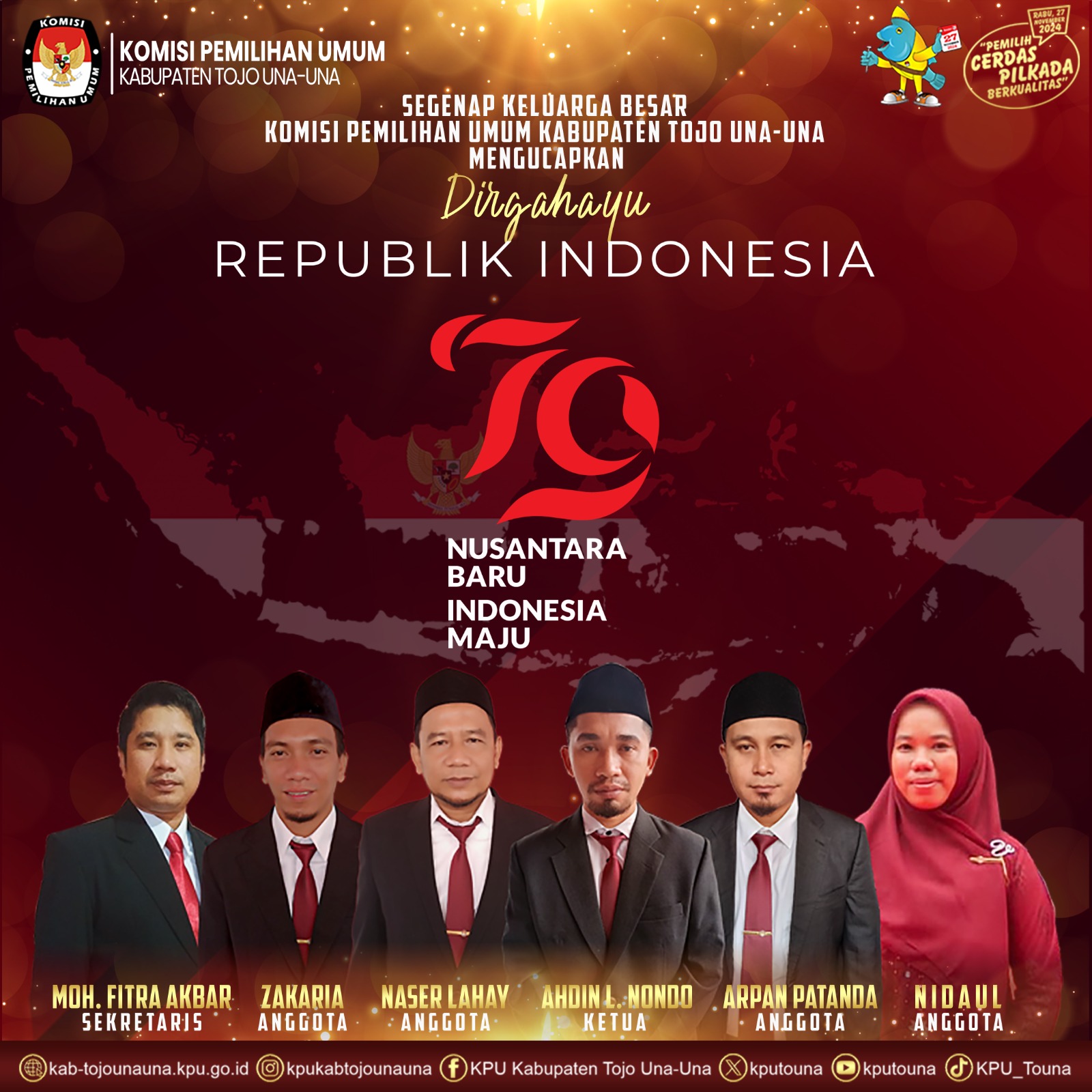 Touna -TemanPemilih, segenap Keluarga Besar Komisi Pemilihan Umum Kabupaten Tojo Una-Una mengucapkan Dirgahayu ke-79 Republik Indonesia, 17 Agustus 1945 – 17 Agustus 2024.
