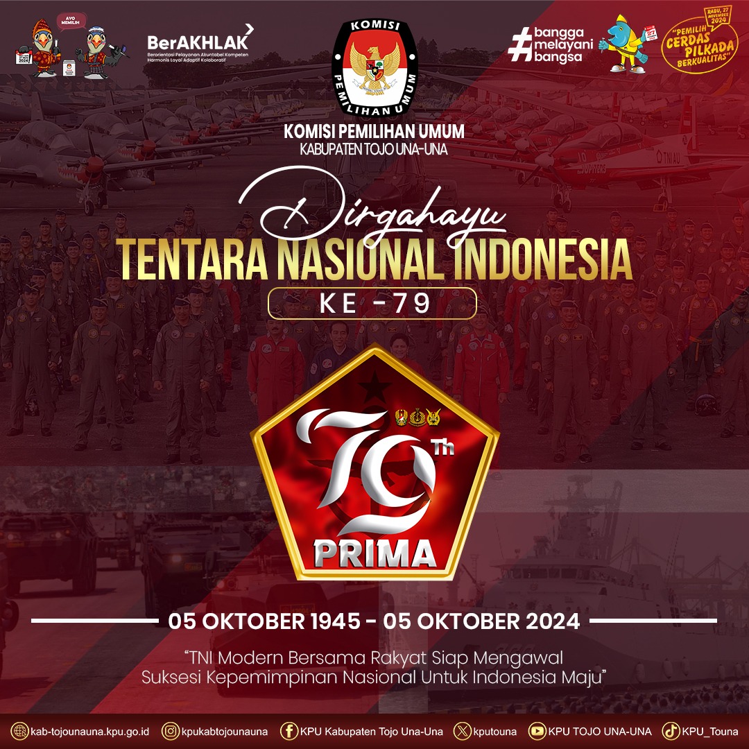 Segenap Keluarga Besar KPU Touna Mengucapkan Dirgahayu TNI Ke 79 TahunRedaksiOktober 7, 2024Advetorial47 Dilihat Post Views: 47 Posting TerkaitKPU Touna Mengucapkan Selamat Memasuki Purna Tugas Presiden RI Ir H Joko Widodo Dan Wakil Presiden Prof.Dr.H.C,K.H Ma’ruf AminPendaftaran Bakal Calon Bupati Dan Wakil Bupati Touna Pada Pilkada 2024Jadwal Pendaftaran Dan Syarat Pendaftaran Calon Bupati Dan Wakil Bupati,Begini Penjelasan KPUJangan LewatkanPasangan IHLAS Resmi Jadi Pemenang Pilkada Touna,Usai KPU Touna Umumkan Di Pleno TerbukaSelamat Kepada KPU RI Atas Raihan PenghargaanKPU Touna Mengucapkan Selamat Natal Dan tahun 2024Selamat Kepada KPU RI Atas Raihan PenghargaanKPU Touna Mengucapkan Selamat Natal Dan tahun 2024Selamat Kepada KPU RI Atas Raihan Penghargaan